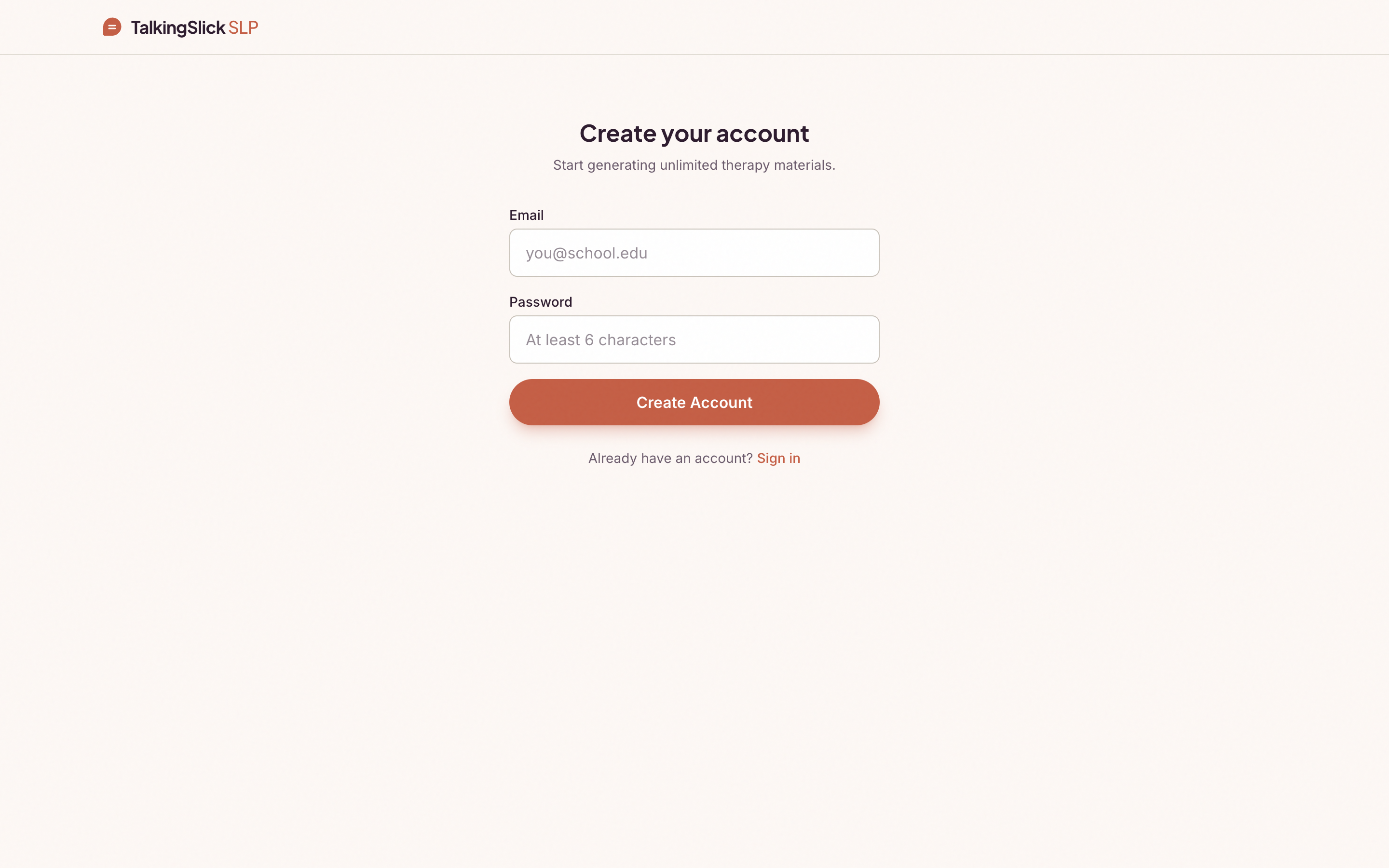 The design philosophy: one primary action per screen. The generator page is a single text box with optional filters — age range toggles and an interests field. No multi-step wizards, no category dropdowns, no material type selectors. The AI figures it out. The color system uses warm, muted tones (eggplant #2D1B2E, terracotta #C45E45, warm pearl #FDF8F5) that reduce eye strain for SLPs working at night.