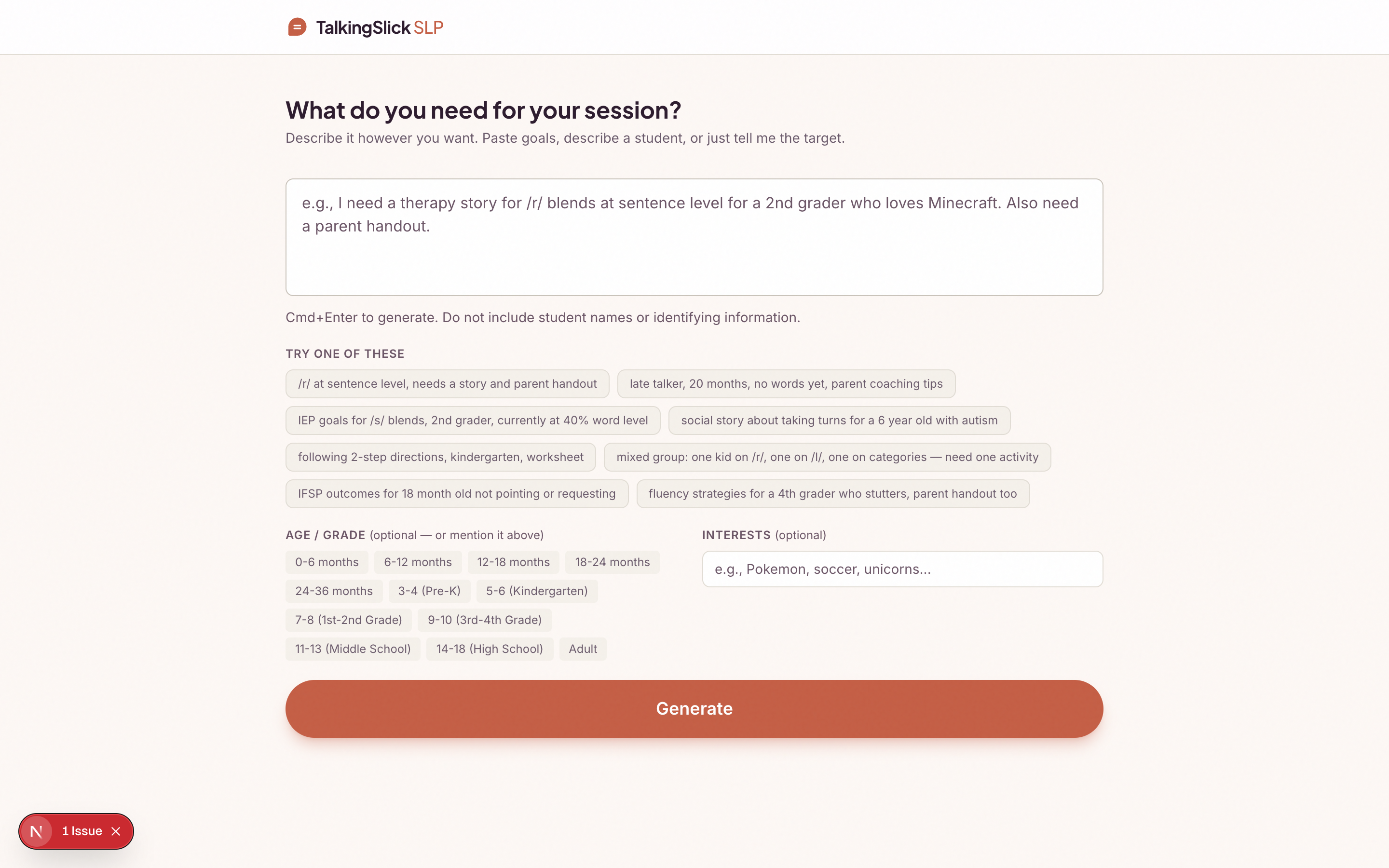 TalkingSlick is a single-purpose tool that does one thing exceptionally well: turn a sentence into a print-ready therapy packet. The 12,000-token system prompt contains deep SLP clinical knowledge — every phonological process, every sound by age of mastery, the ABCD goal format, Carol Gray social story structure, and the entire EI coaching model. The AI auto-detects what the SLP needs and generates the right combination of materials.